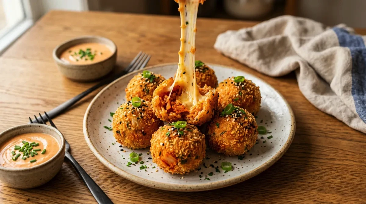 Mix chopped kimchi, cream cheese, scallion, and sesame oil together, then fold in mozzarella cubes gently.