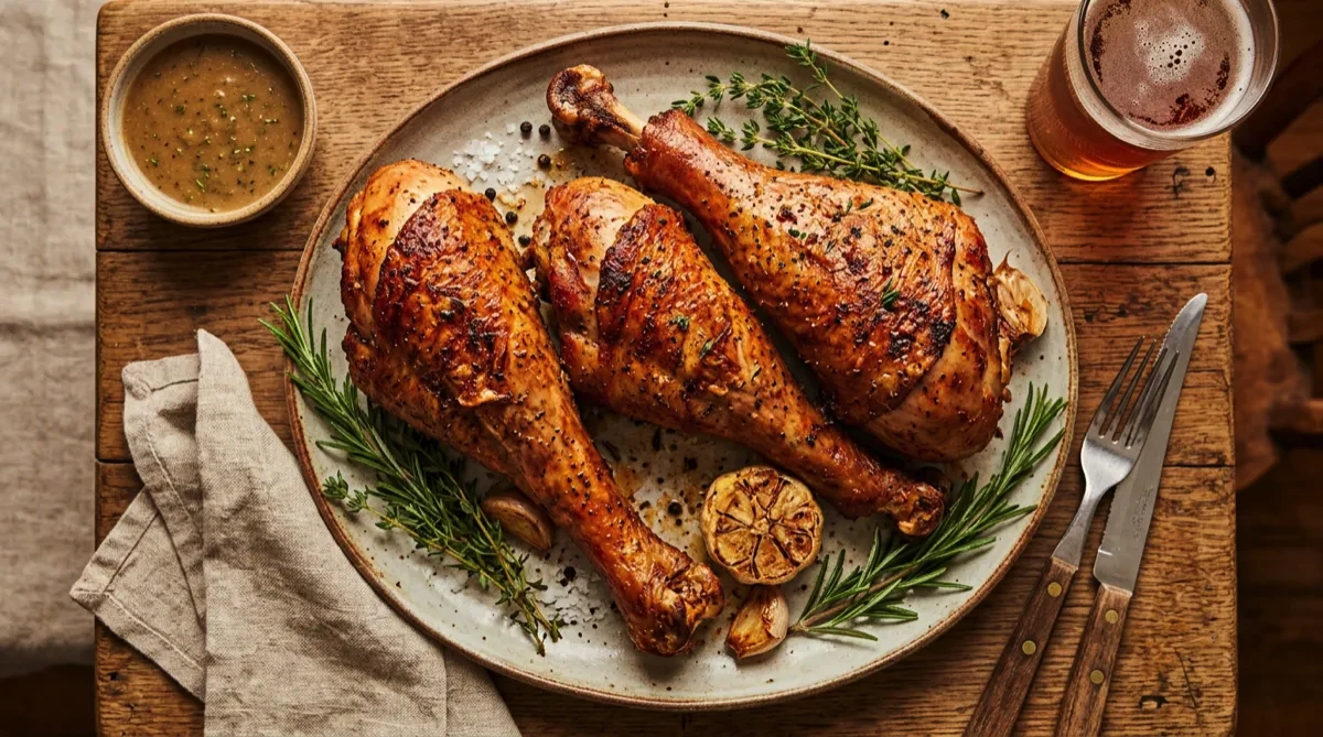 Tip: Turkey legs are dark meat, so they need a higher internal temp than breast (175°F vs 165°F) for the best texture. The connective tissue needs to break down. Flipping frequently ensures even, crispy skin all around. Wrapping the bone end in foil makes them easier to hold.