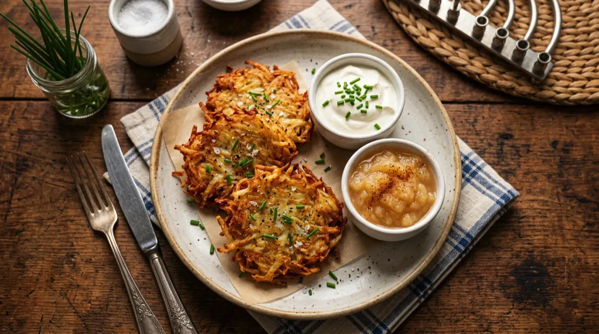 Serve immediately with sour cream, applesauce, and chives.