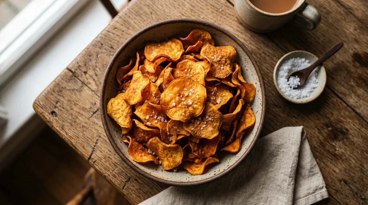 Tip: Sweet potatoes have more sugar than russets, so they burn faster — watch closely after 12 minutes. Mandoline is essential for even thickness. They curl and look done before they're actually crispy; wait for the edges to darken.