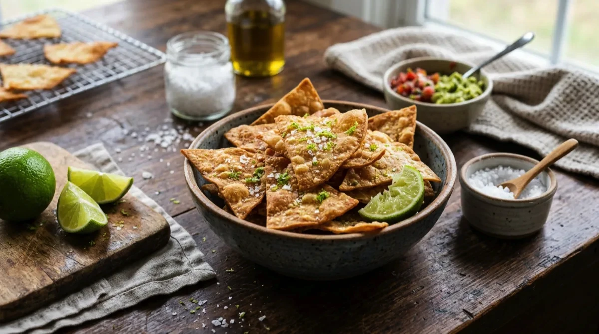 Immediately squeeze lime juice over hot chips and sprinkle with salt (and chili powder or cumin if using).
