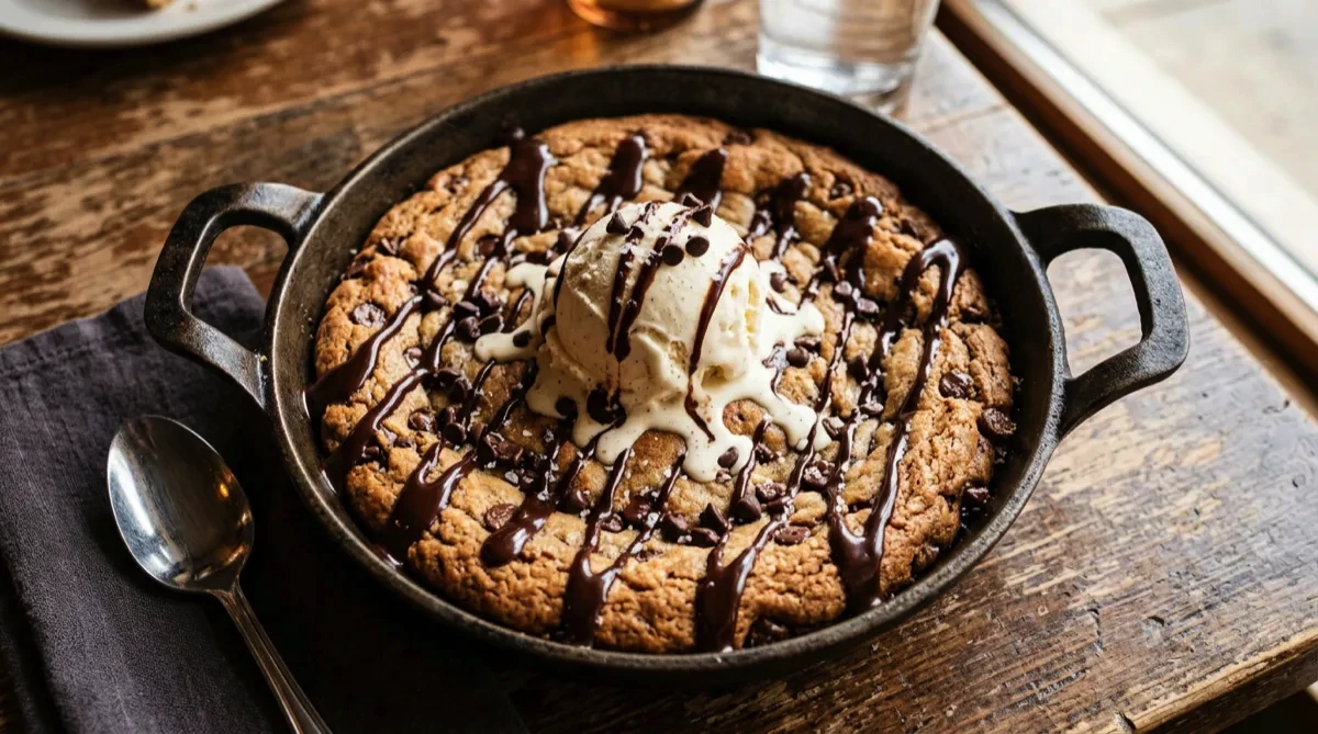 Tip: Pull it early — the center should look underdone. It continues cooking in the hot pan and sets up into a perfectly gooey center. Overbaked pizookie is just a big cookie.