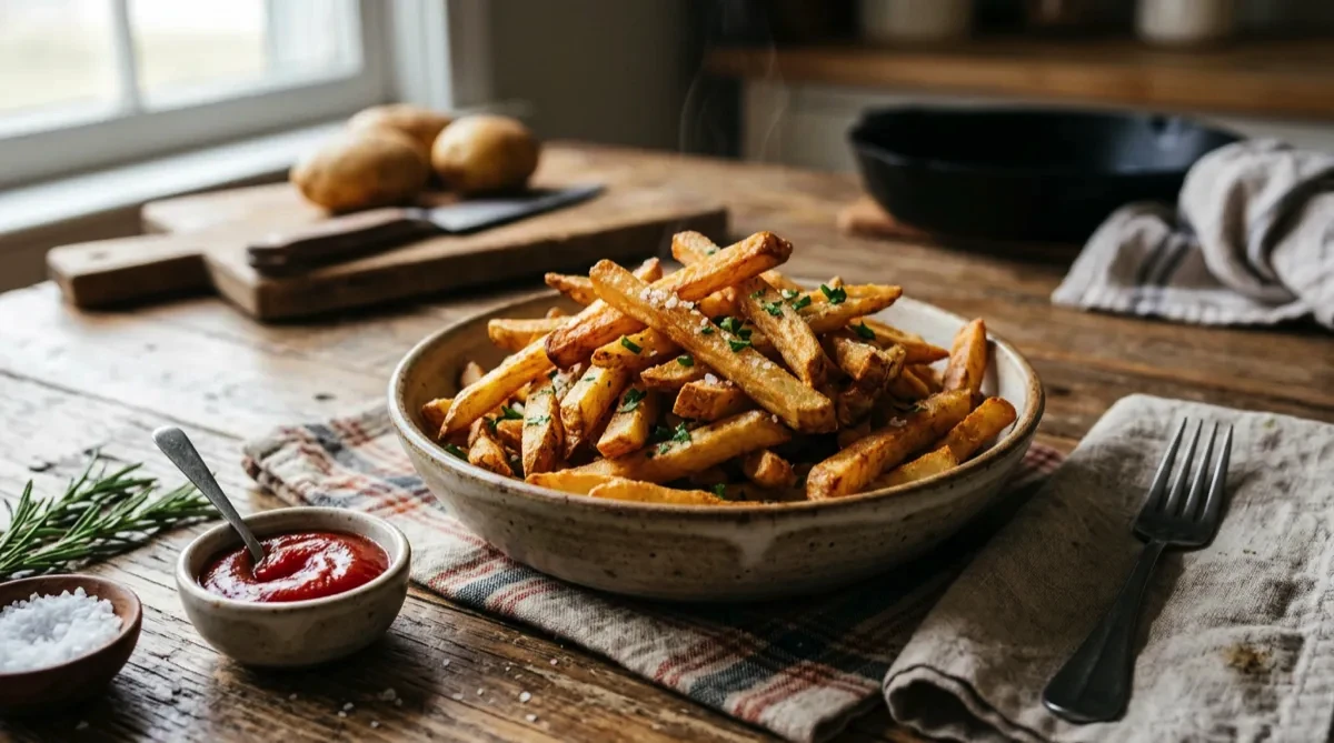 Tip: The 30-minute soak removes surface starch — it's the difference between soggy and shattering fries. Cornstarch adds extra crunch. Dry them thoroughly or they'll steam instead of fry.