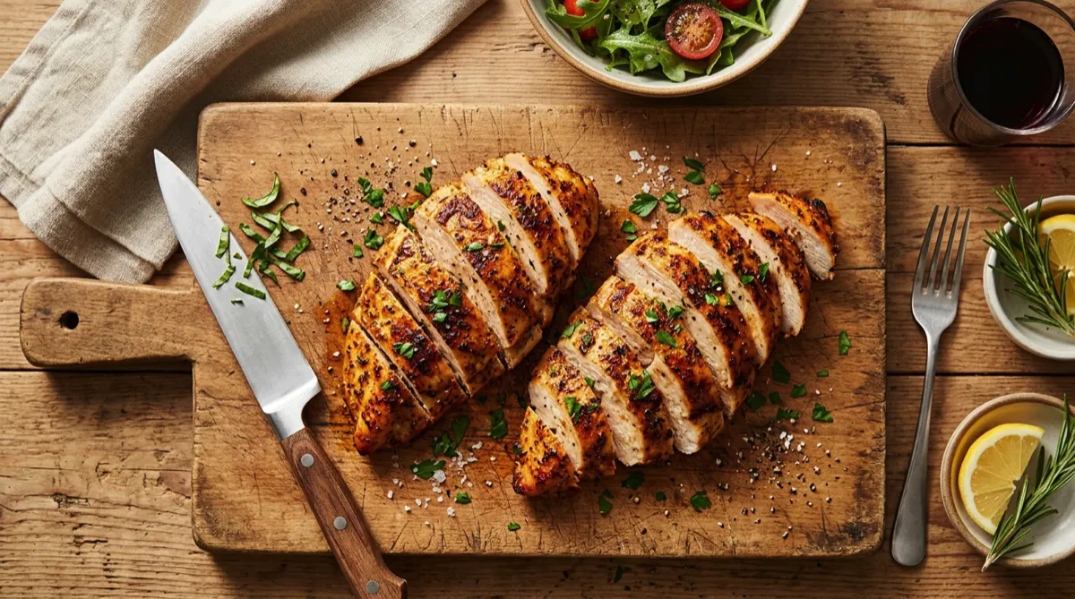 Tip: Pounding to even thickness is the single most important step — thick ends overcook while thin ends dry out. Rest the chicken 5 minutes under foil; it continues cooking and the juices redistribute. Slice against the grain always.